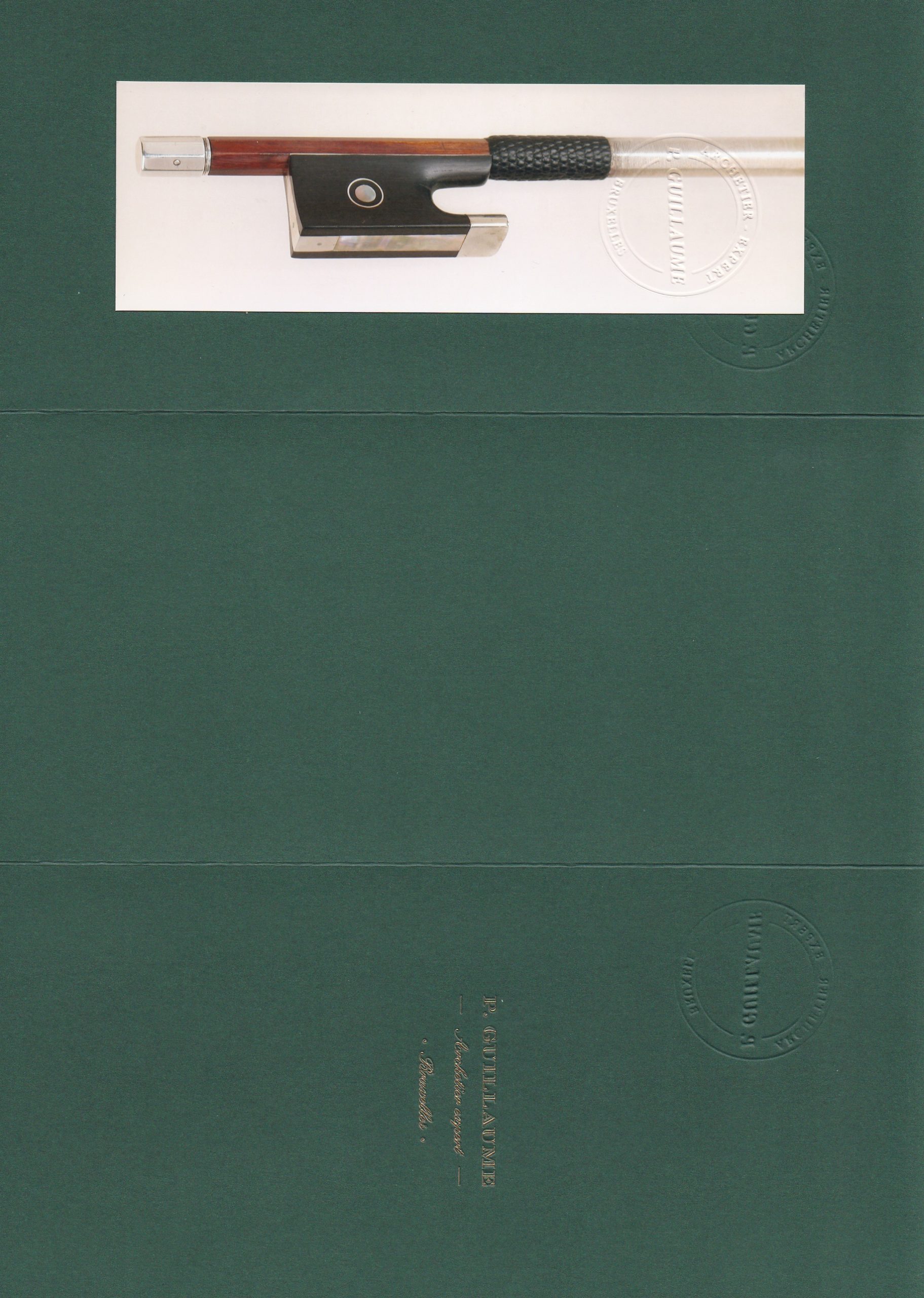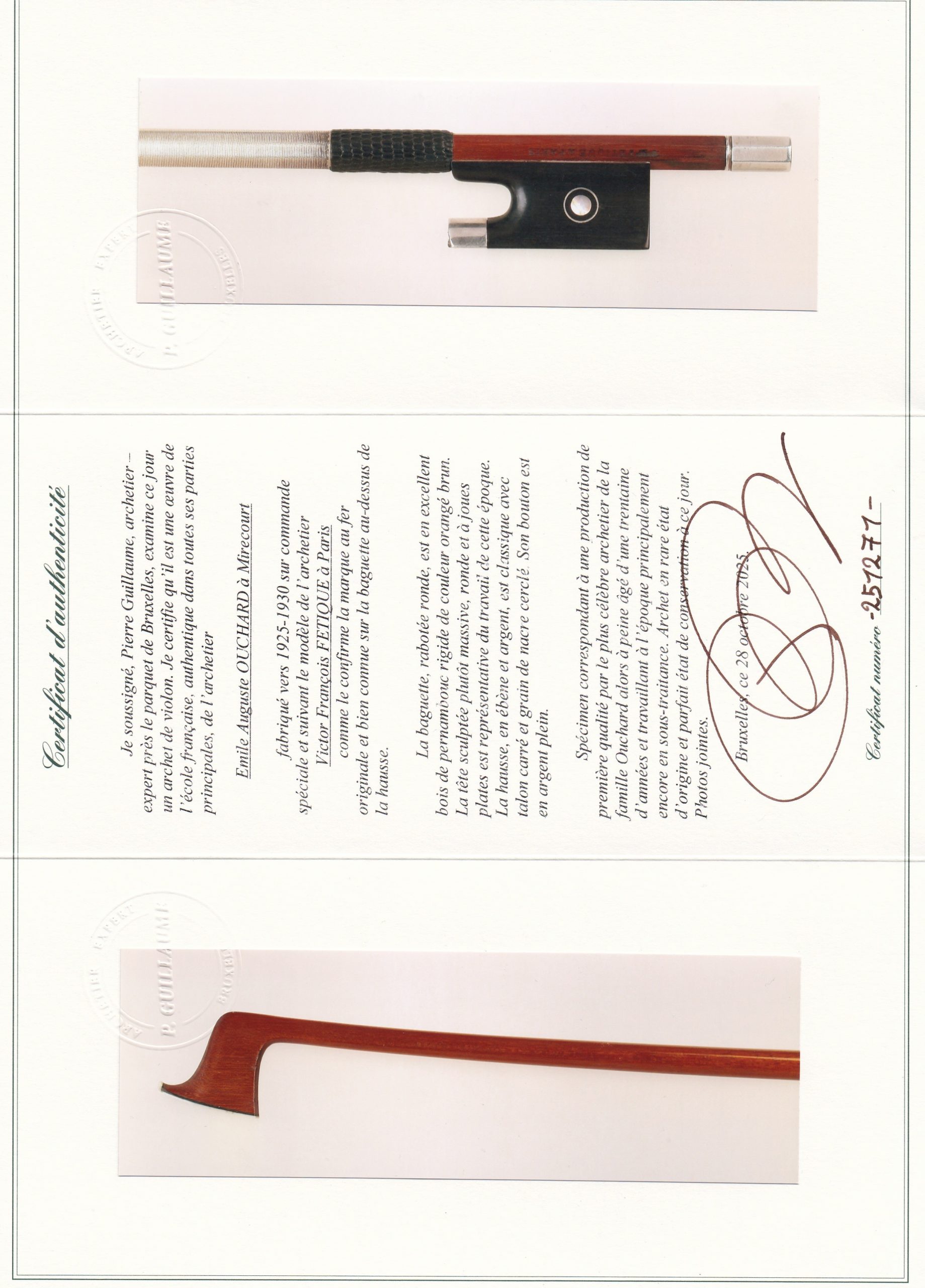 | NEU | Violinbogen: Émile Auguste Ouchard, Paris zw. 1929 und 1930 Artikelnummer: A02037 Kategorien: < 25.000 €, Bögen, Preiskategorie, Violine Schlagwörter: 1929, 1930, atelier alfredo clemente, Bogen, Émile Auguste Ouchard, Geige, geigenbogen, instrument, Victor François Fétique, Violinbogen Bei Interesse kontaktieren Sie uns bitte: +49 (0)221-5103922 info@clementestrings.com Zum Kontaktformular Enthält 19% MwSt. zzgl. Versand Lieferzeit: bis zu 6 Werktage Beschreibung Beschreibung Violinbogen Émile Auguste Ouchard für Victor François Fétique gebaut in Paris zwischen 1929 und 1930 gestempelt „V.tor Fetique á Paris“ Zertifikat von Pierre Guillaume