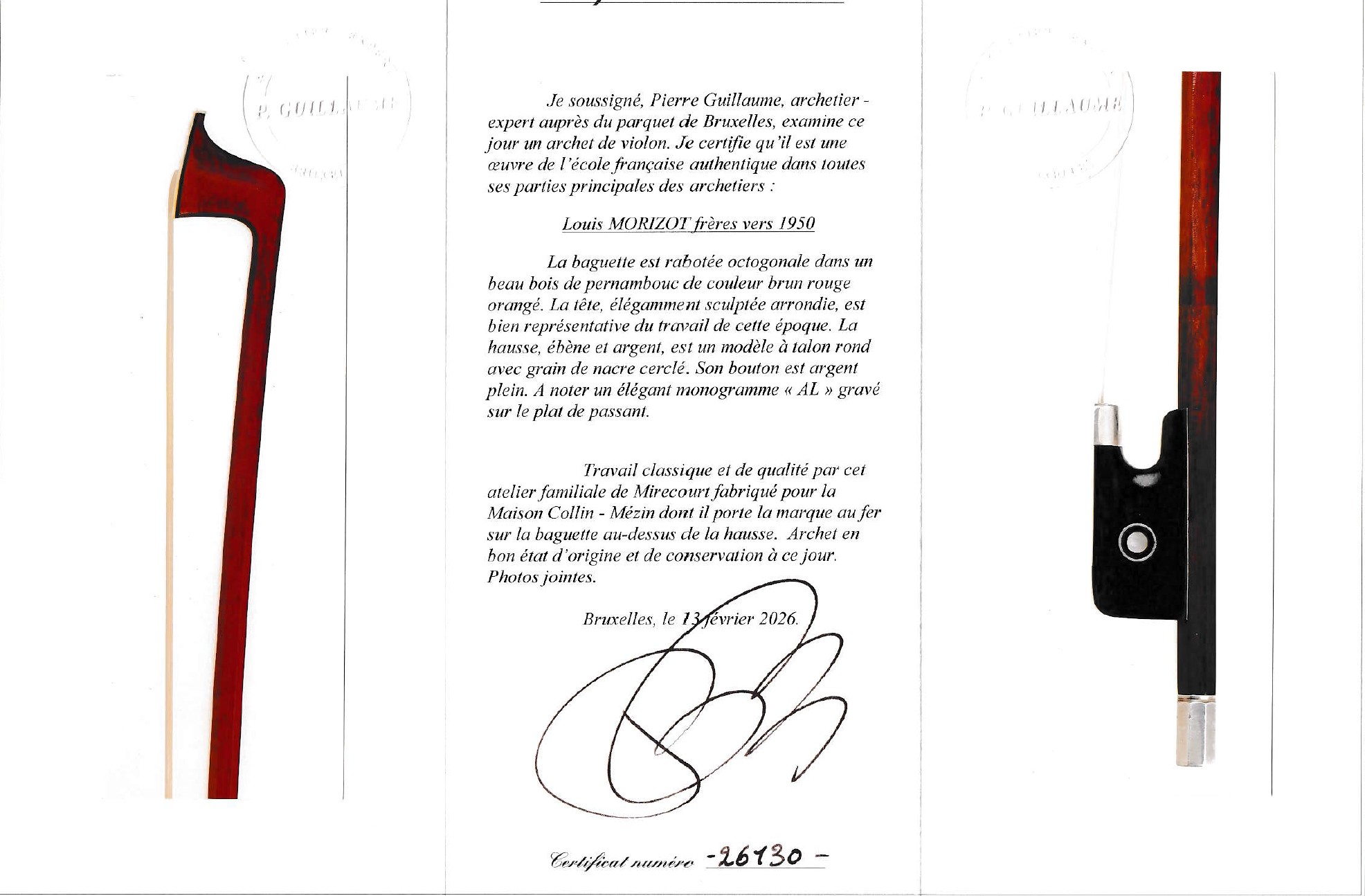| NEU | Violinbogen: Louis Joseph Morizot (frères), Mirecourt um 1950 Artikelnummer: A02072 Kategorien: < 10.000 €, Bögen, Preiskategorie, Violine Schlagwörter: 1950, atelier alfredo clemente, Bogen, geigenbogen, instrument, Louis Joseph Morizot, Mirecourt, Violinbogen Bei Interesse kontaktieren Sie uns bitte: +49 (0)221-5103922 info@clementestrings.com Zum Kontaktformular Enthält 19% MwSt. zzgl. Versand Lieferzeit: bis zu 6 Werktage Beschreibung Beschreibung Violinbogen Louis Joseph Morizot (frères) gebaut in Mirecourt um 1950 gestempelt „Collin-Mezin“ Zertifikat von P. Guillaume