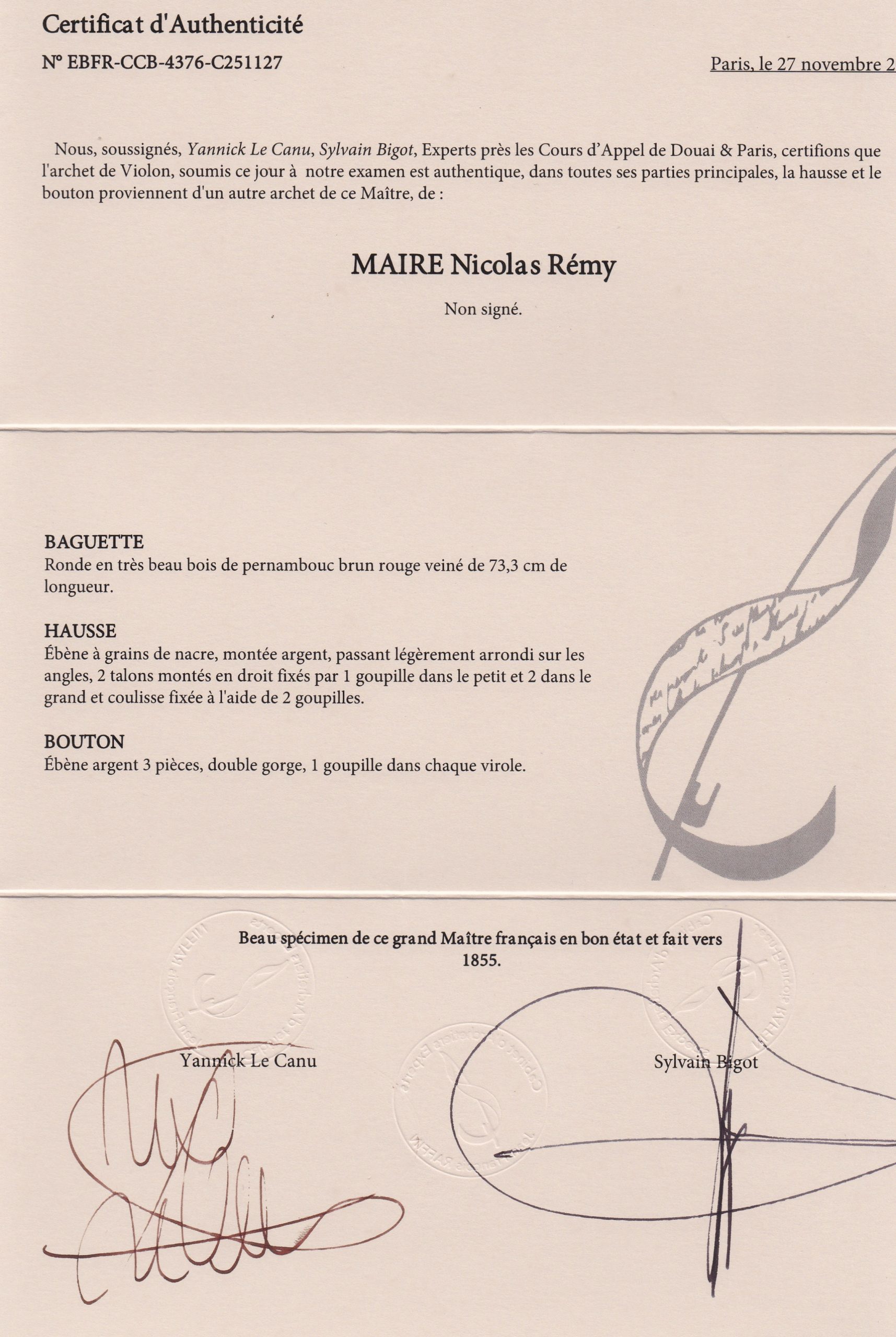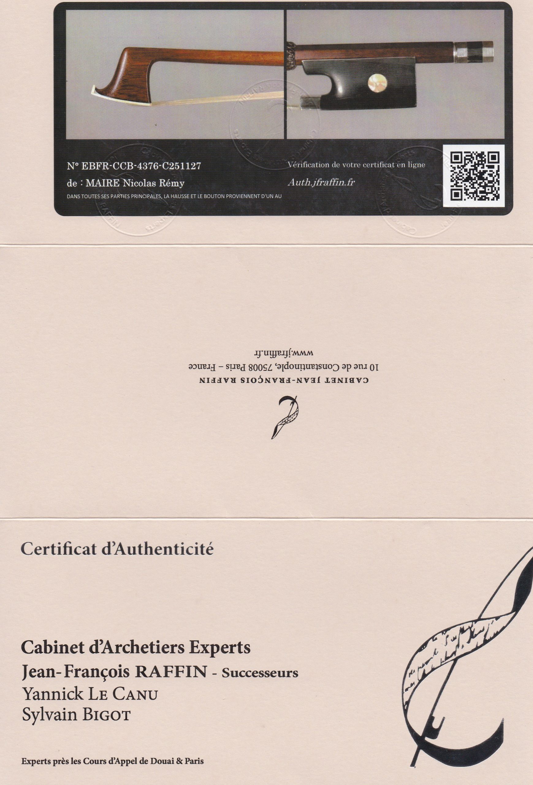 | NEU | Violinbogen: Nicolas Rémy Maire, Paris um 1855 Artikelnummer: A01986 Kategorien: < 100.000 €, Bögen, Preiskategorie, Violine Schlagwörter: 1855, atelier alfredo clemente, Bogen, geigenbogen, instrument, Nicolas Remy Maire, paris, streichinstrument, Violinbogen Bei Interesse kontaktieren Sie uns bitte: +49 (0)221-5103922 info@clementestrings.com Zum Kontaktformular Enthält 19% MwSt. zzgl. Versand Lieferzeit: bis zu 6 Werktage Beschreibung Beschreibung Violinbogen Nicolas Rémy Maire gebaut in Paris um 1855 Zertifikat Cabinet Raffin