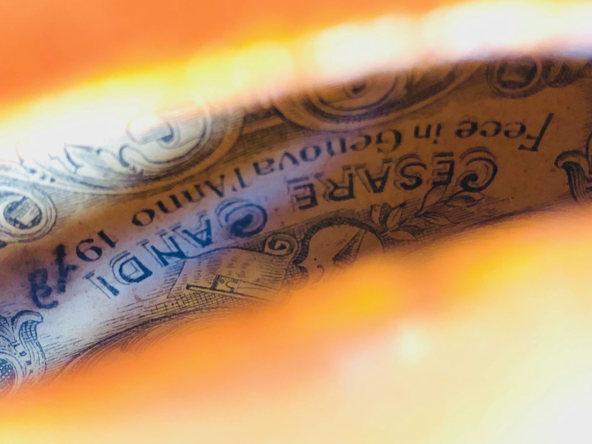 | NEU | Violine: Cesare Candi, Genua 1918 Artikelnummer: A02032 Kategorien: < 100.000 €, Preiskategorie, Streichinstrumente, Violinen Schlagwörter: 1918, atelier alfredo clemente, Cesare Candi, Geige, Genua, instrument, streichinstrument, Violine Bei Interesse kontaktieren Sie uns bitte: +49 (0)221-5103922 info@clementestrings.com Zum Kontaktformular Enthält 19% MwSt. zzgl. Versand Lieferzeit: bis zu 6 Werktage Beschreibung Beschreibung Violine Cesare Candi gebaut in Genua im Jahr 1918 mit Etikett „Cesare Candi, Genova 1918 No. 105“ Zertifikat von E. Blot
